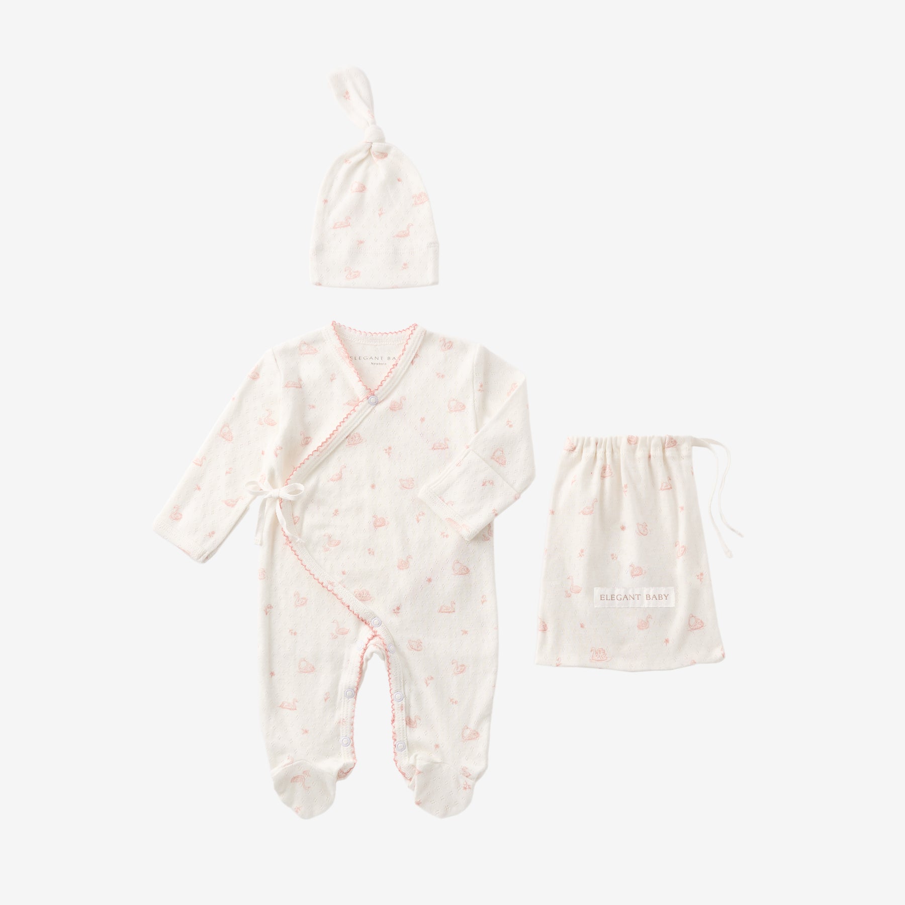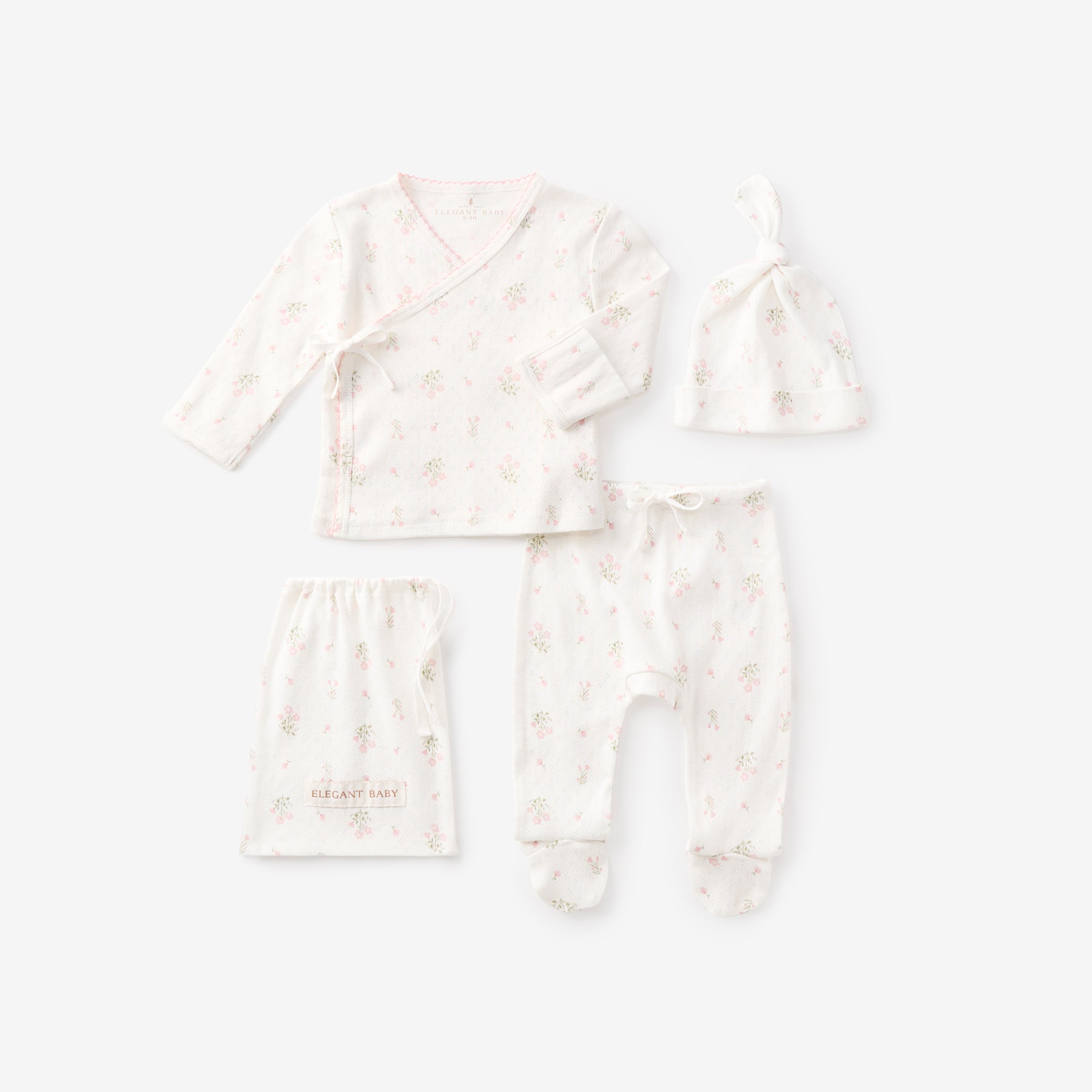 A set of of luxury newborn* essentials that are almost as dreamy as that new baby smell. Make a little one's homecoming extra special with this four-piece set of super soft, elegant pointelle knit outfit, packaged in a re-usable drawstring bag.