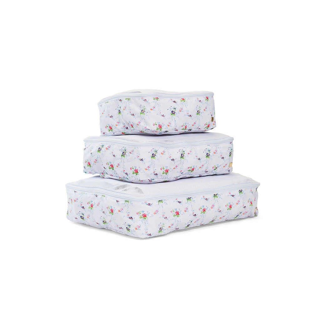 Don't leave home without yourPacking Squad- these are a TRVL Game changer!!Imagine how satisfying it is to open your suitcase and know exactly where everything is in our pretty custom printed cubes! Designed in a super lightweight material that will keep your clothes neat and super organized. All 3 cubes comes have a poly mesh top panel and they fit perfectly into your luggage and drawers so you can pack and unpack in a flash!