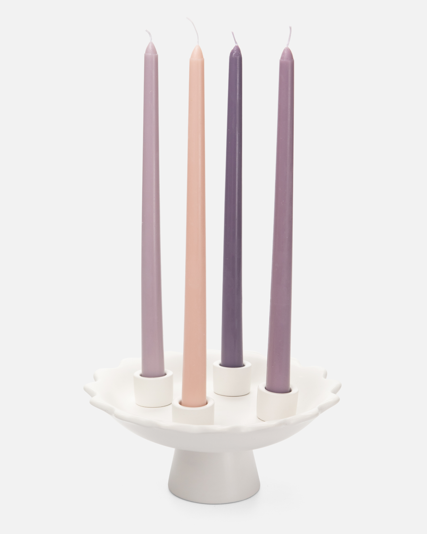 The scalloped Advent Wreath is a modern take on the traditional Advent Wreath. It is made of ceramic. Pair with our ombre soy Advent candles.